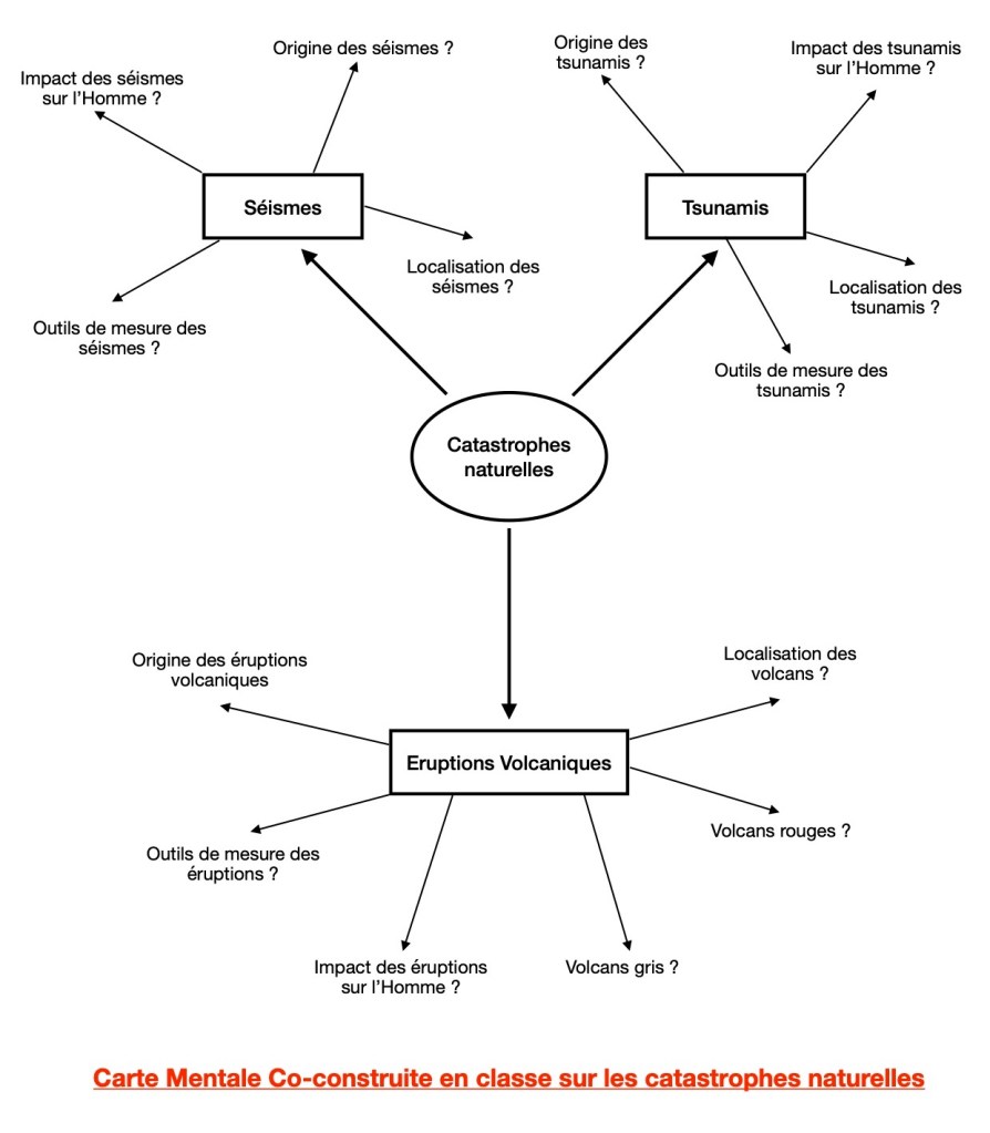De nombreuses catastrophes naturelles ébranlent les populations actuelles : séismes, éruptions volcaniques, tsunami …. En classe, avec l’aide de plusieurs vidéos, nous avons co-construit une carte mentale pour regrouper l’ensemble des questions autour de trois grandes catastrophes majeures