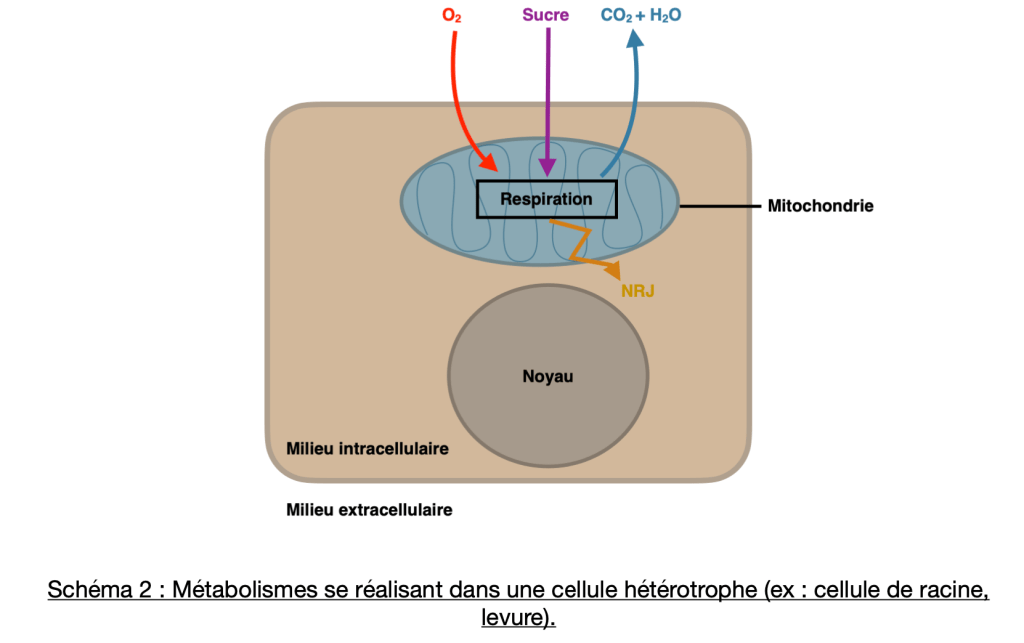Toutes les cellules grâce au dioxygène et au glucose vont faire de l’énergie par un phénomène : la respiration cellulaire (se déroulant dans les mitochondries). Voir schéma n°1 et 2.