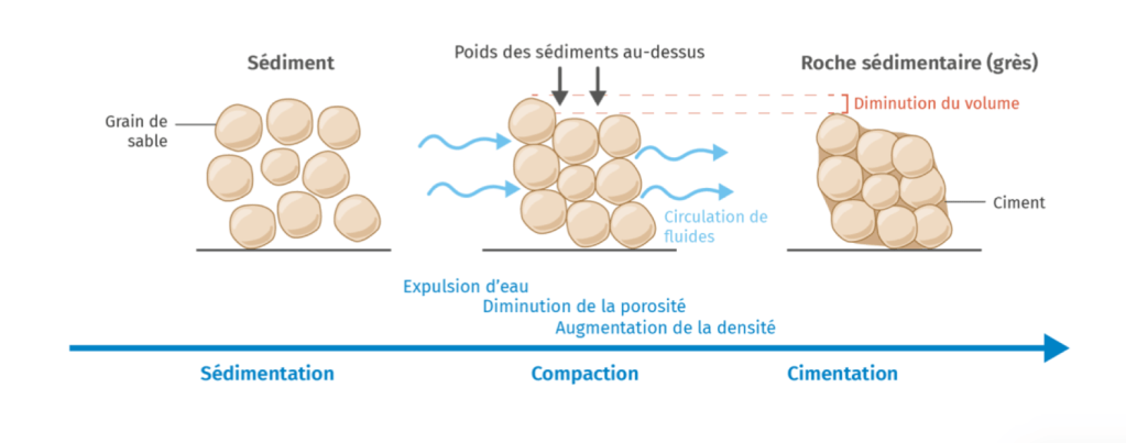 Les roches sédimentaires se forment quand les sédiments déposés sont recouverts par des sédiments plus récents. Ils se retrouvent alors entrainés en profondeur. L’augmentation de la température et de la pression au cours de l’enfouissement provoque une diminution de la porosité et donc d’une compaction des sédiments en roche (voir document 1 de l’activité 4). Un ciment peut aussi se former au niveau des pores, cela rendra la roche sédimentaire cohérente (=dont il est difficile de séparer les morceaux).